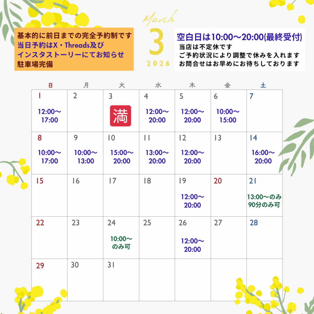 3月最新の営業カレンダーのお知らせです